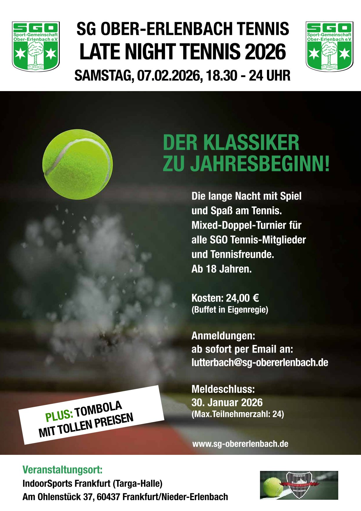DER KLASSIKER ZU JAHRESBEGINN! Die lange Nacht mit Spiel und Spaß am Tennis. Mixed-Doppel-Turnier für alle SGO Tennis-Mitglieder und Tennisfreunde.Ab 18 Jahren. Kosten: 24,00 €(Buffet in Eigenregie) Anmeldungen ab sofort
